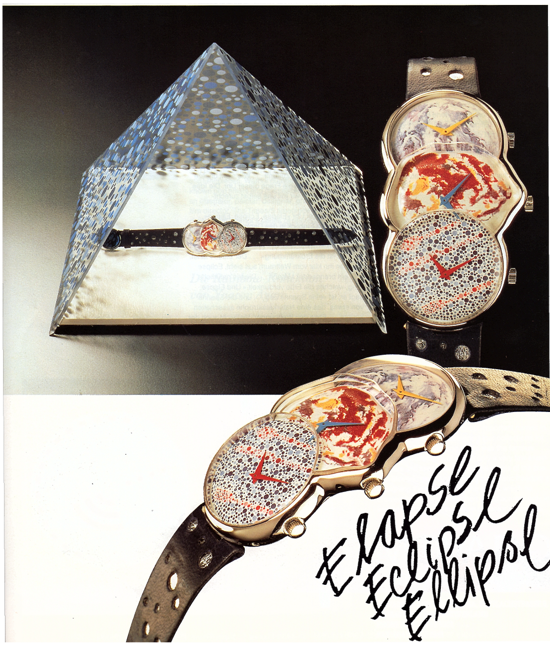 1991 wurde “Elapse, Eclipse, Ellipse” in Basel vorgestellt mit der das Unternehmen Movado Watch Company SA eine Kunstreihe fortsetzt. Die in limitierter Sammlerauflage von 180 Stück hergestellte Armbanduhr hat drei voneinander unabhängige mechanische Werke und Handaufzug sowie drei Zifferblätter auf drei Ebenen, mit gewölbten Saphirgläsern.