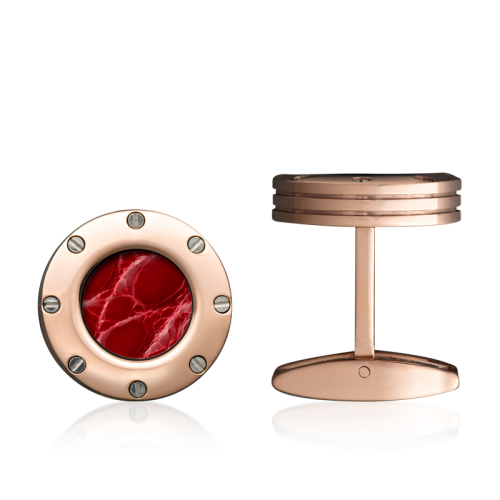 Poliertee Rotgold (IP-Rosé) verschraubte Edelstahl Manschettenknöpfe mit rubinrotem echten Alligator-Leder und Edelstahl Schrauben.
