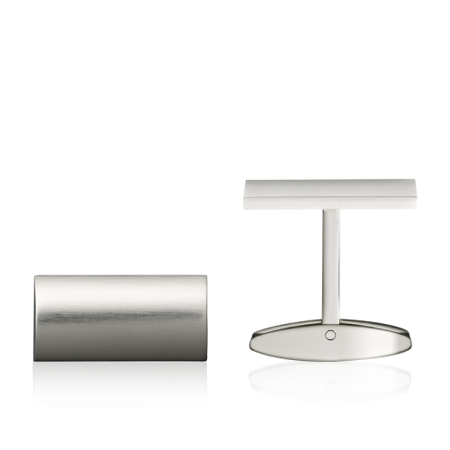 Anatomisch geformte rechteckige Manschettenknöpfe aus poliertem Edelstahl mit einer Satin Oberfläche aus mattem Edelstahl.